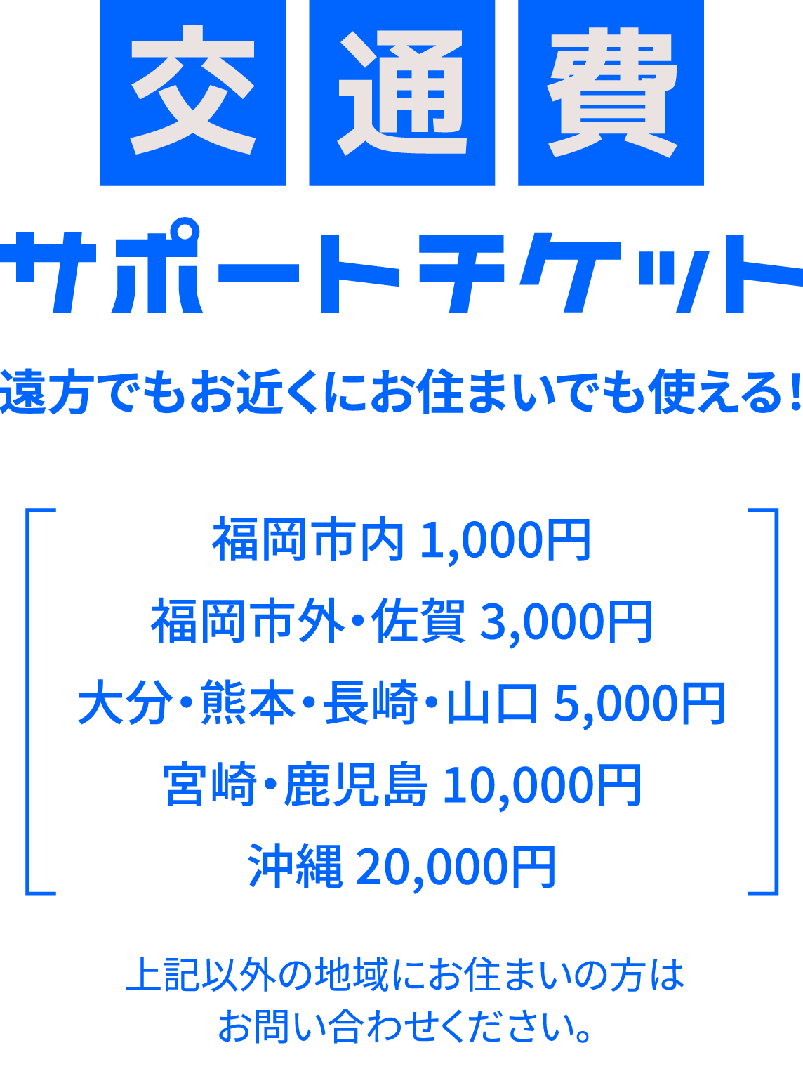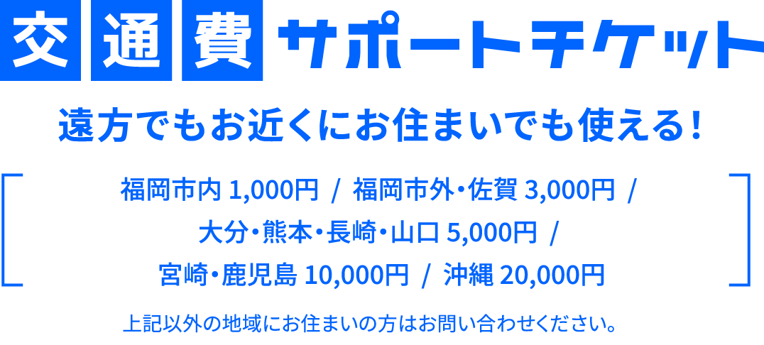※チケットは、その他のサポートチケットとの併用はできません。 ※チケットのご利用は1回までとなります。※福岡校で開催するオープンキャンパス(体験授業、学校説明会、平日学校説明会、公開授業)のみご利用可能です。 ※チケットをお持ちでも、一部サポート対象外になる場合があります。 ※本校への入学を検討されているご本人様のみ対象となります。 ※金額は事前の案内なしに変更となる場合がございます。