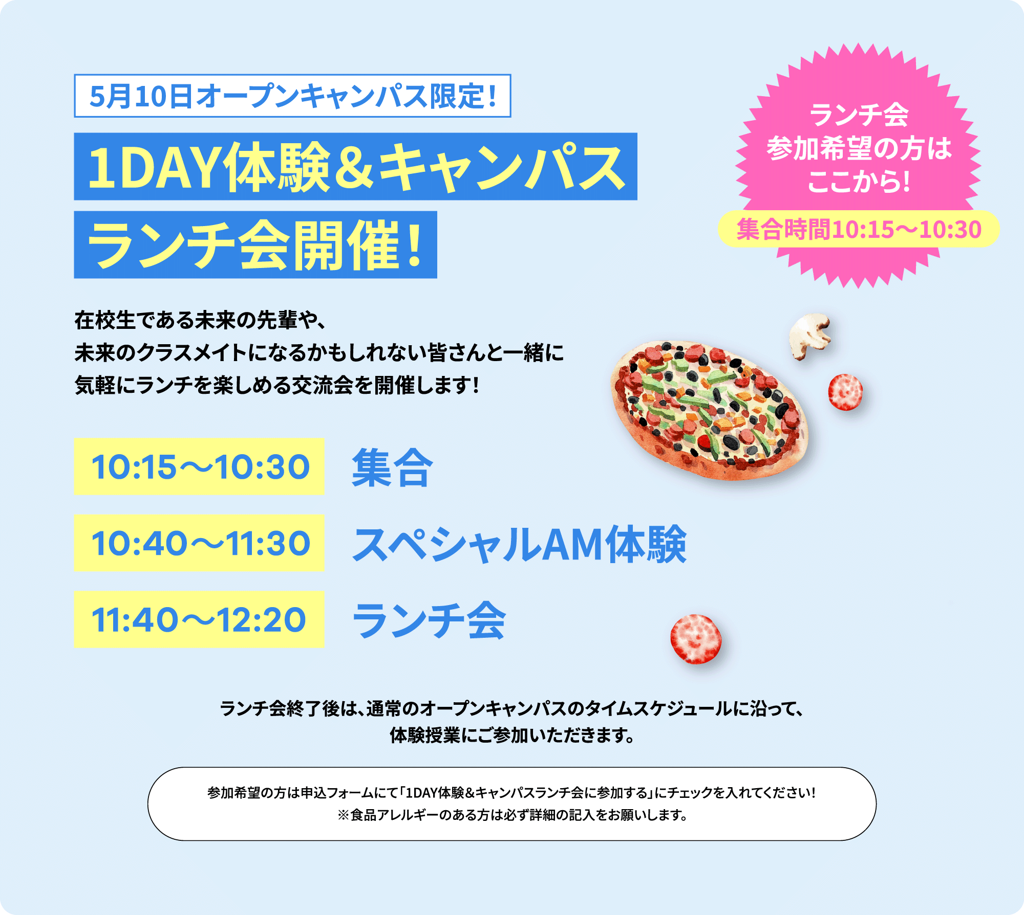 選択されたコースとは別にお好きな授業を当日に選んで体験することができます!なかなか決まらなくても大丈夫!職員があなたに合ったコースを一緒に考えてくれます。