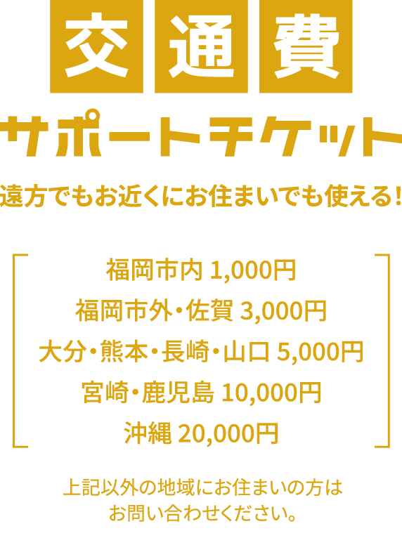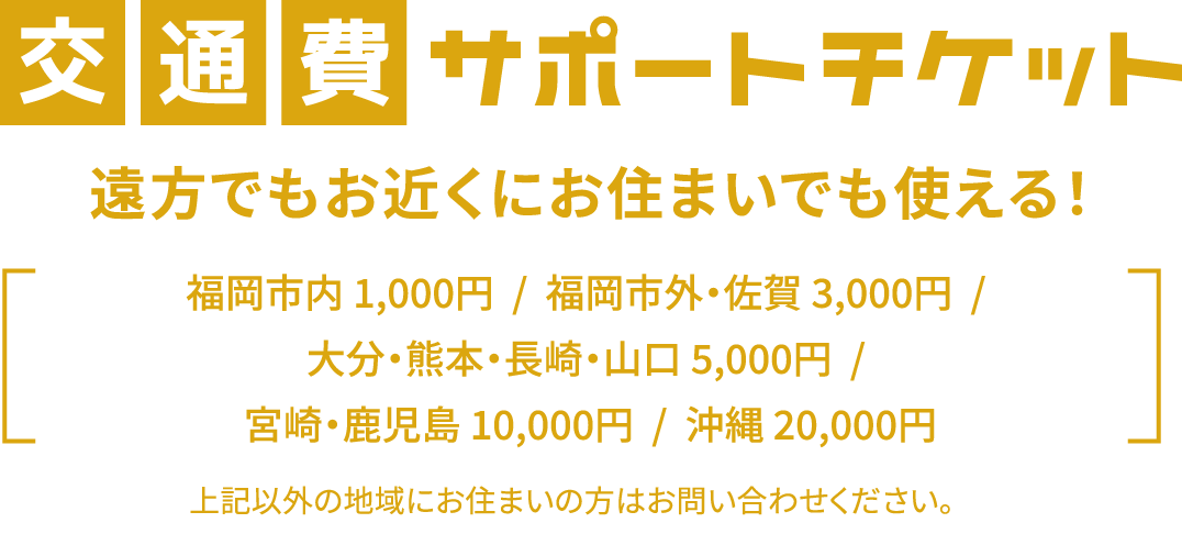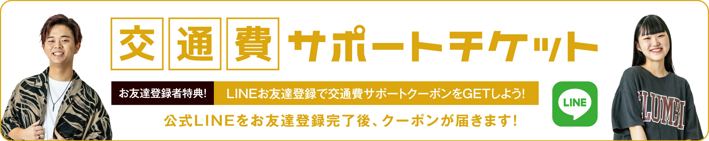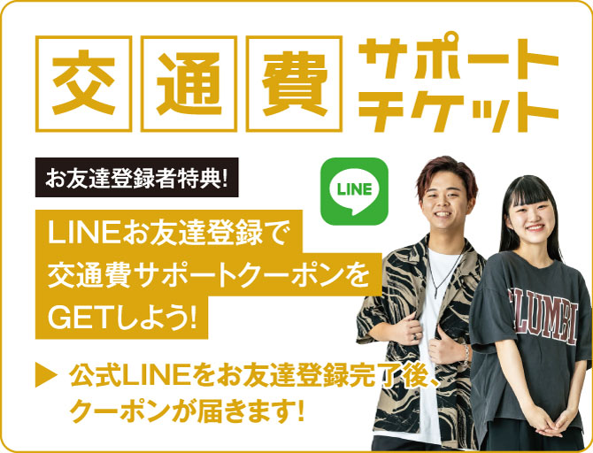 ※チケットは、その他のサポートチケットとの併用はできません。 ※チケットのご利用は1回までとなります。※福岡校で開催するオープンキャンパス(体験授業、学校説明会、平日学校説明会、公開授業)のみご利用可能です。 ※チケットをお持ちでも、一部サポート対象外になる場合があります。 ※本校への入学を検討されているご本人様のみ対象となります。 ※金額は事前の案内なしに変更となる場合がございます。