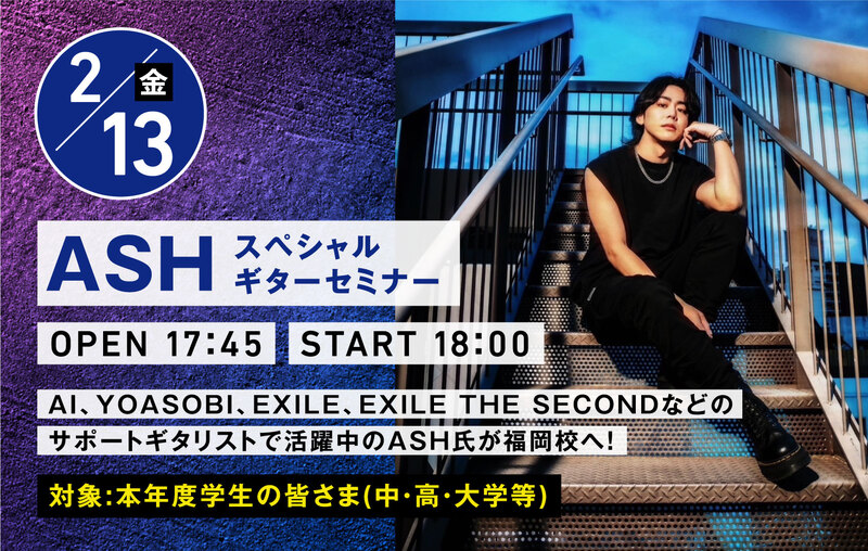 AI/ YOASOBI/EXILE/EXILE THE SECONDなどのサポートギタリストで活躍中のASH氏が福岡校へ!