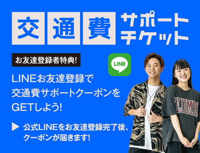 LINE登録後に発行される交通費サポートクーポンで交通費をサポートいたします。オープンキャンパス終了後に1階の職員室のスタッフにクーポンをご提示ください。必要事項を記入いただき、完了後にサポート金額を現金でお渡しします。