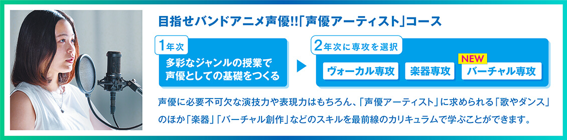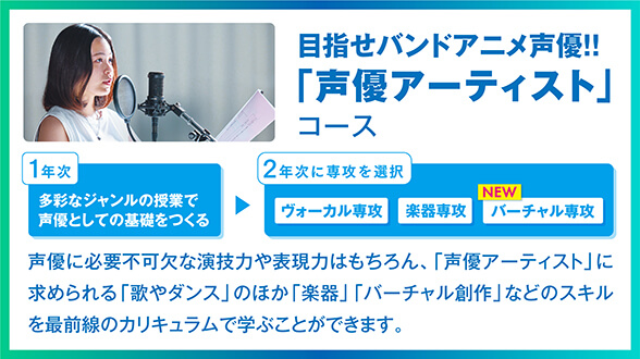 声優としてのスキルを磨きながら、エンタテインメントの総合校という多彩な学習環境をいかし、多様な力を求められる今の声優業界に 対応する力を養う。
