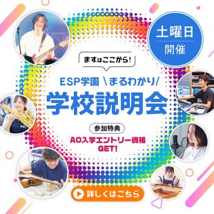 全て見る 緊急のお知らせ アフターレポート イベント トピックス 入学情報 スチューデントボイス 先輩の声~スタッフ編 ESP学園生作品 在校生の方へ 2025.10.13 PICK UP 【土曜日開催】まずはここから!ESPまるわかり学校説明会 イベント トピックス 入学情報 2025.10.10 【俳優養成コース】前期公演を開催しました! アフターレポート イベント トピックス 2025.10.09 PICK UP 【11/16(日)】Spark with coldrain in ESPエンタテインメント東京 中高生限定セミナー開催! イベント 入学情報 2025.10.09 【2025前期管楽器コンサート🎉】 アフターレポート イベント トピックス 2025.10.09 【11月分更新】学校見学会およびオンライン説明会にご参加の方へ 入学情報 2025.10.03 ホームカミングデイ2025開催‼ イベント 2025.10.03 PICK UP 11/1(土)2(日)楽園祭 GAKUENSAI 2025開催 イベント 2025.10.03 楽園祭 2025の楽しみ方!【FOOD DRINK】 イベント 2025.10.03 楽園祭 2025の楽しみ方!【展示ブース】 イベント 2025.10.03 楽園祭 2025の楽しみ方!【LIVE】 イベント 2025.09.30 ギタークラフト科×関大地(ハルカミライ)コラボギター製作!【第4弾】 ESP学園生作品 2025.09.30 2027年4月始動の新設学科説明会! イベント トピックス 入学情報 2025.09.29 PICK UP 【2026年度4月入学を検討中の方へ】 募集についてのお知らせ(9/29更新) 入学情報 2025.09.26 「1番好きなアーティストとして名前を言ってもらえるように」【シンガーソングライターコース】 スチューデントボイス 2025.09.11 【声優養成コース】声優授業内歌唱発表会2025イベントレポート! アフターレポート イベント トピックス 1234 LINE登録でお得な情報をGET
