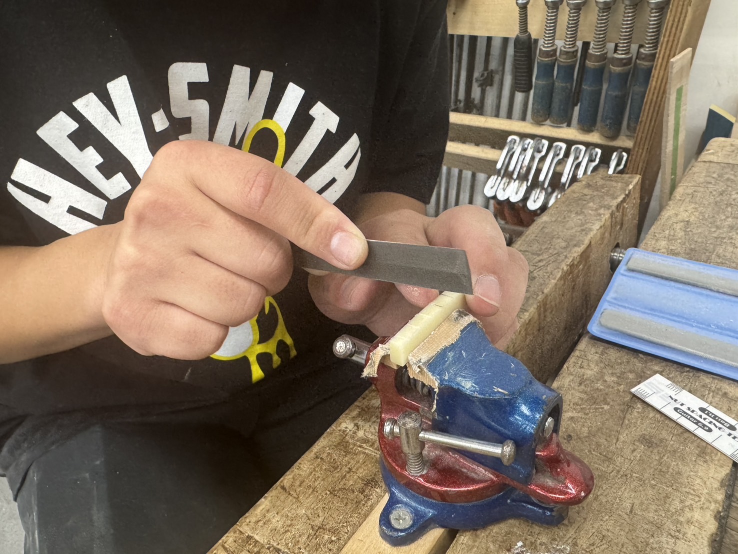 専用の各弦のサイズに合ったやすりで、弦の通る溝を成型します。