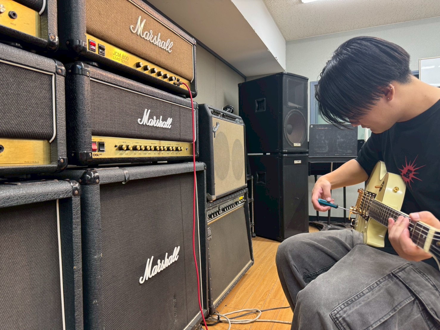 地下のスタジオにて、Marshallの壁を前にして大きな音で確認します。