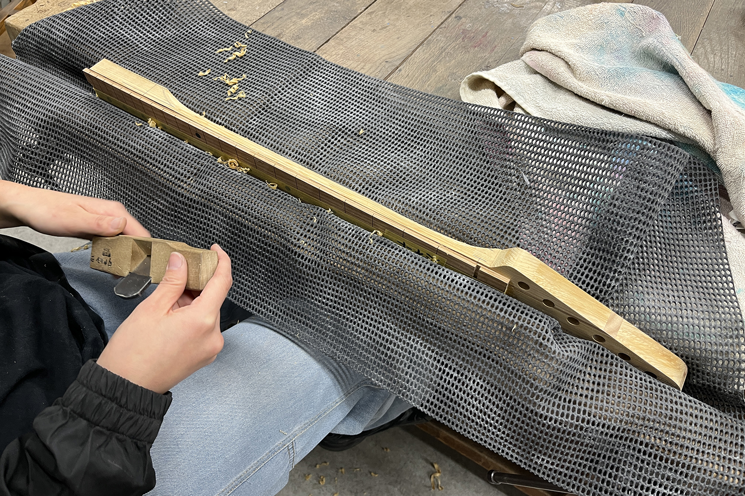 まず、接着後に指板からはみ出しているネック材を削っていきます。