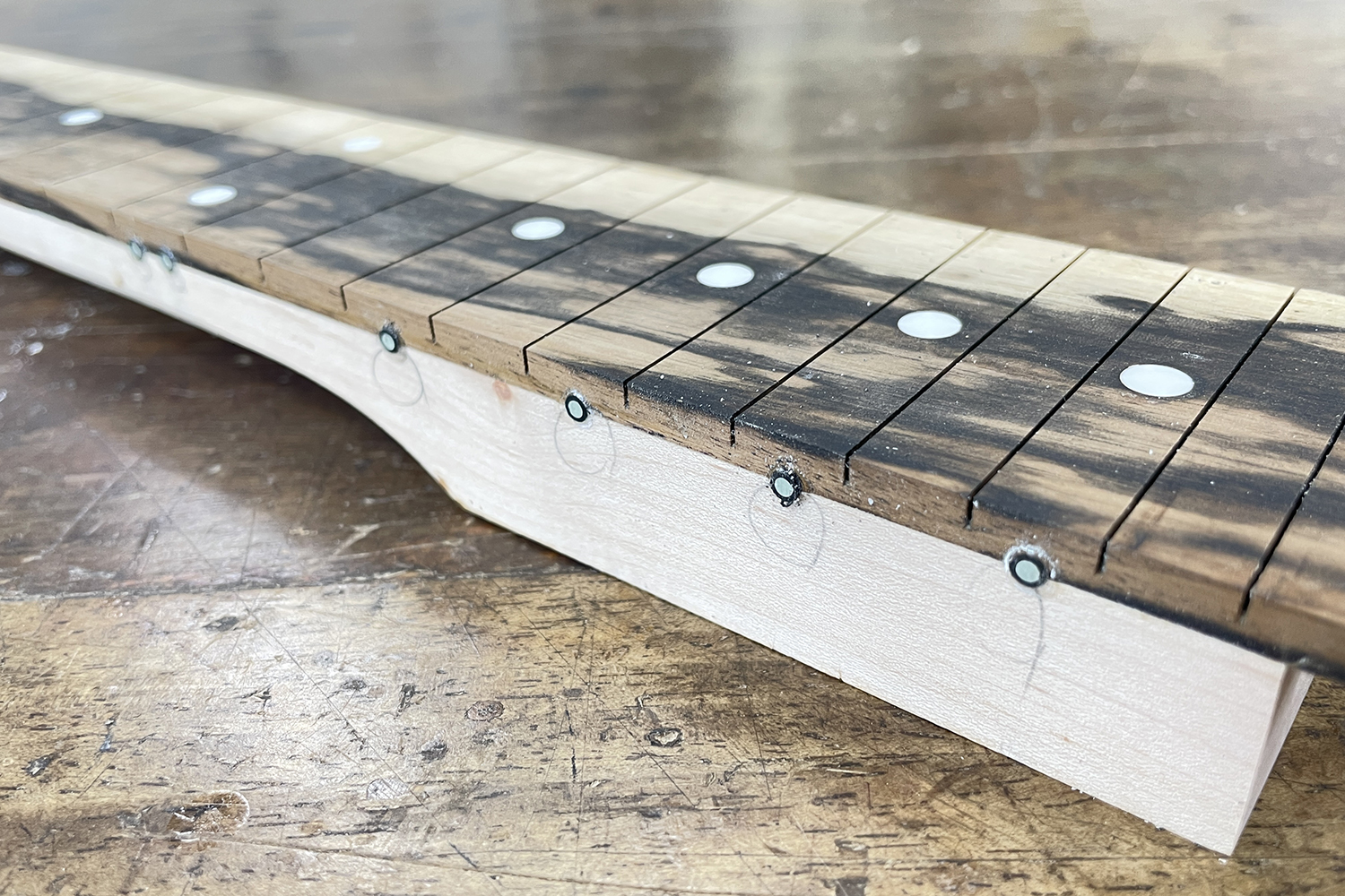 指板の側面に丸い溝を掘り、サイドポジションマークを埋めて接着していきます。今回は「ルミンレイ」という蓄光素材を使用しました。光を蓄えて発光する為、暗いステージでの演奏もバッチリです。