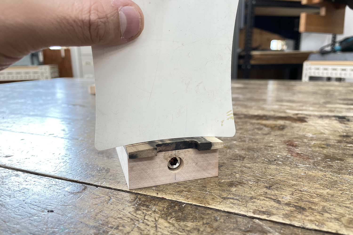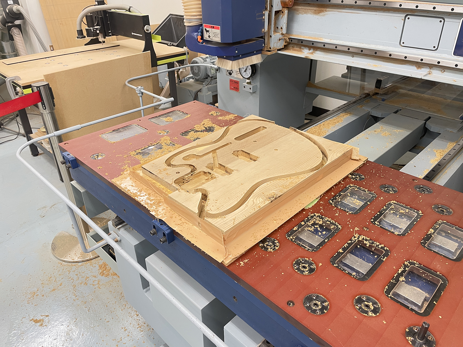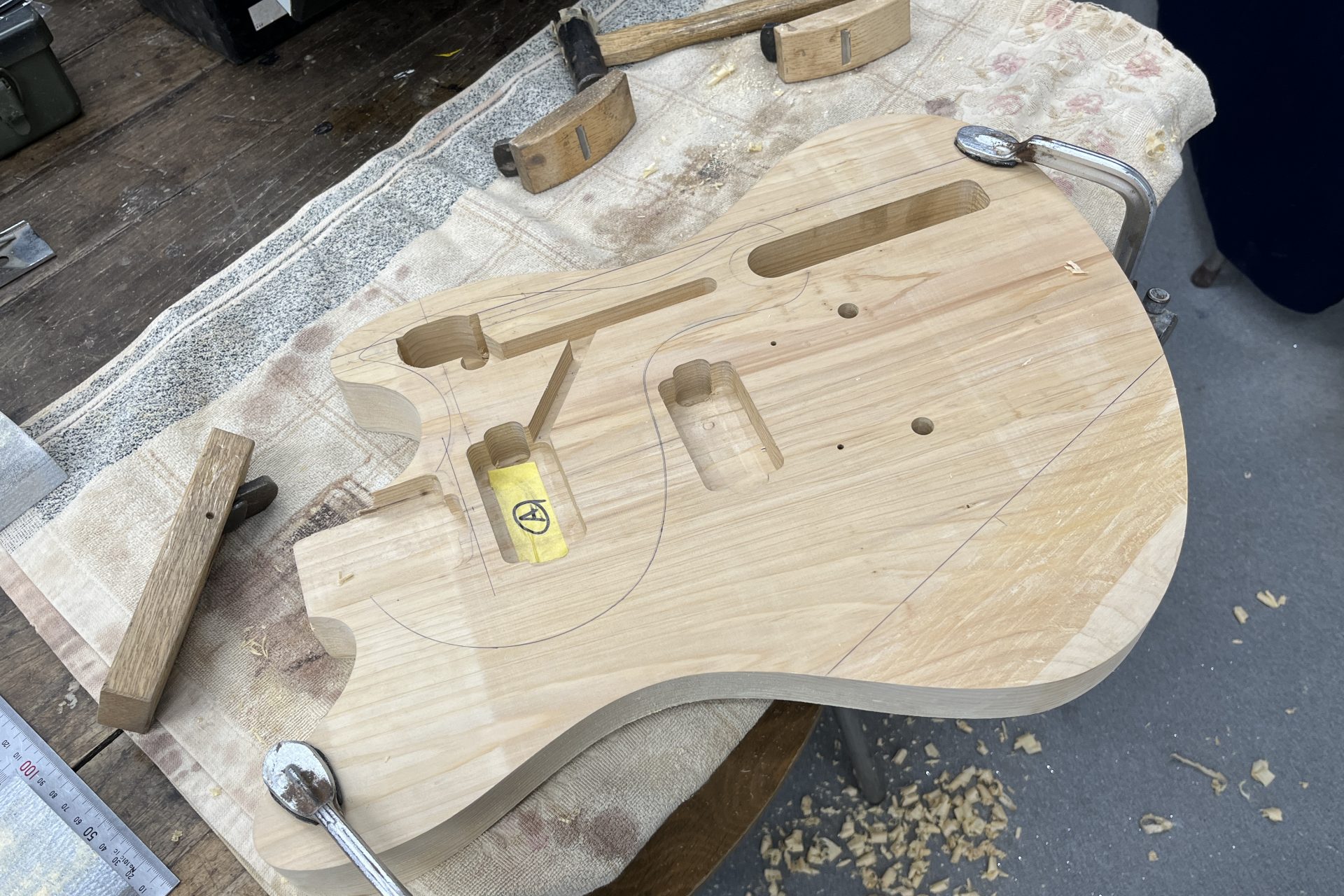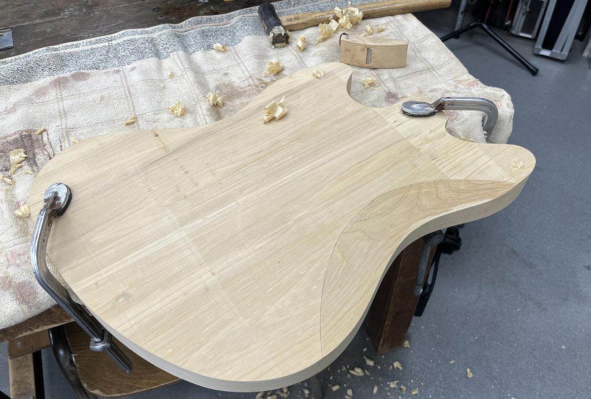 カンナやヤスリを使用し、エルボーカットやバックカット(ウエストカット)のような、コンターと呼ばれる部分の加工を進めていきます。CNCルーターである程度まで加工する事も出来るのですが、形状や深さの確認の為に今回は手加工で行うことにしました。