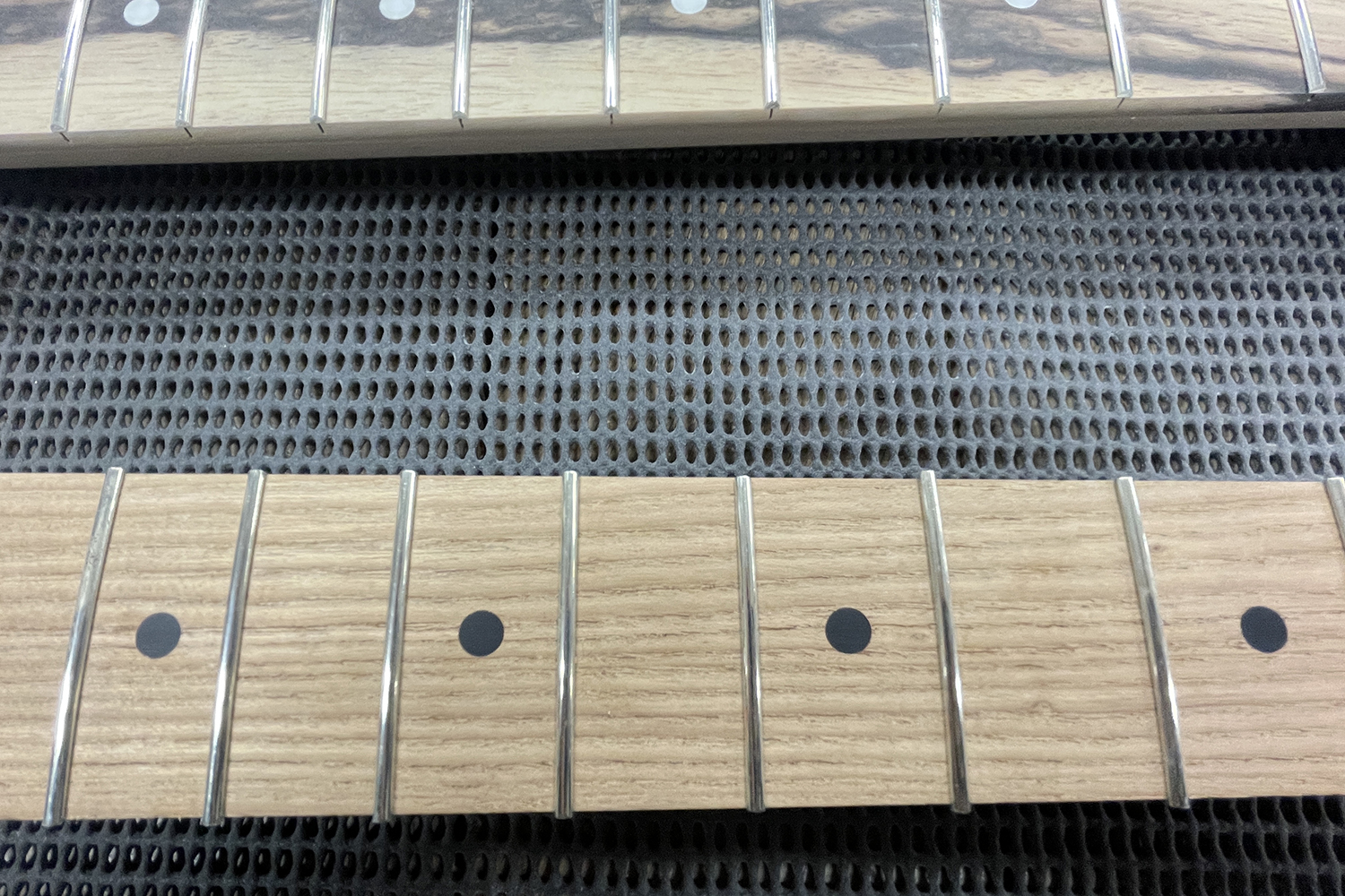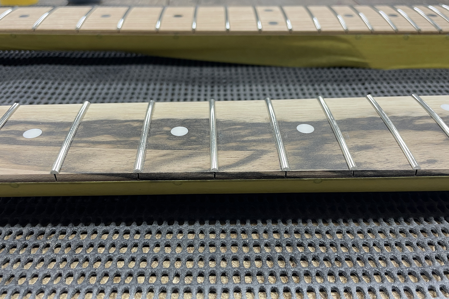 まずはフレットの土台となる指板アール(曲面)の成型、指板調整を行い、表面が整ったらフレットを打ち込んでいきます。