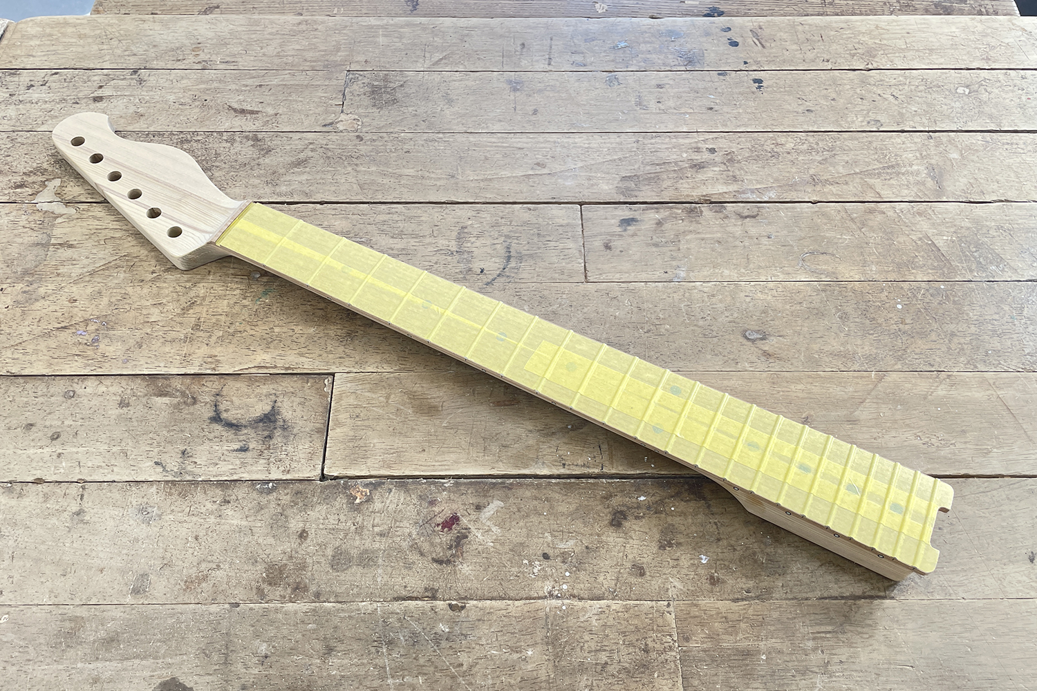 今回、指板表面には塗膜を作らない仕様にしているので、塗装を乗せない部分にはマスキングテープで保護。
