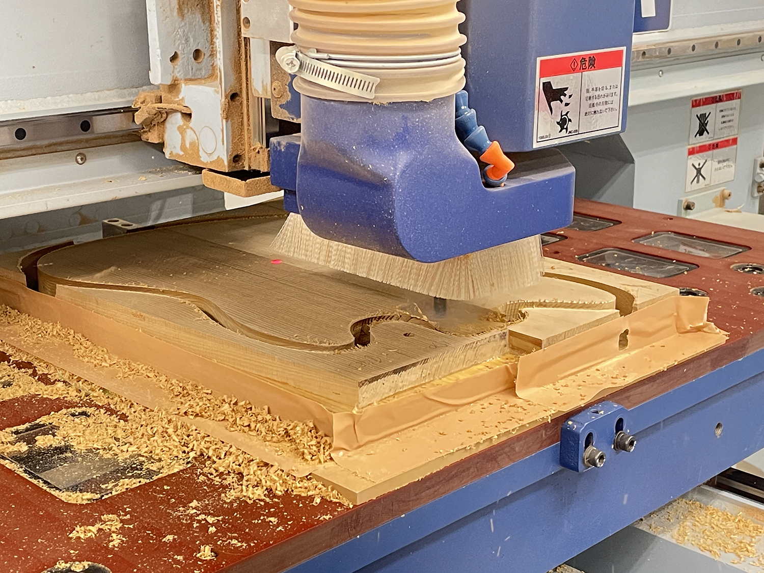 PCで設計した図面と3Dデータを元にプログラムを作成し、CNCルーターでの切削加工へ。