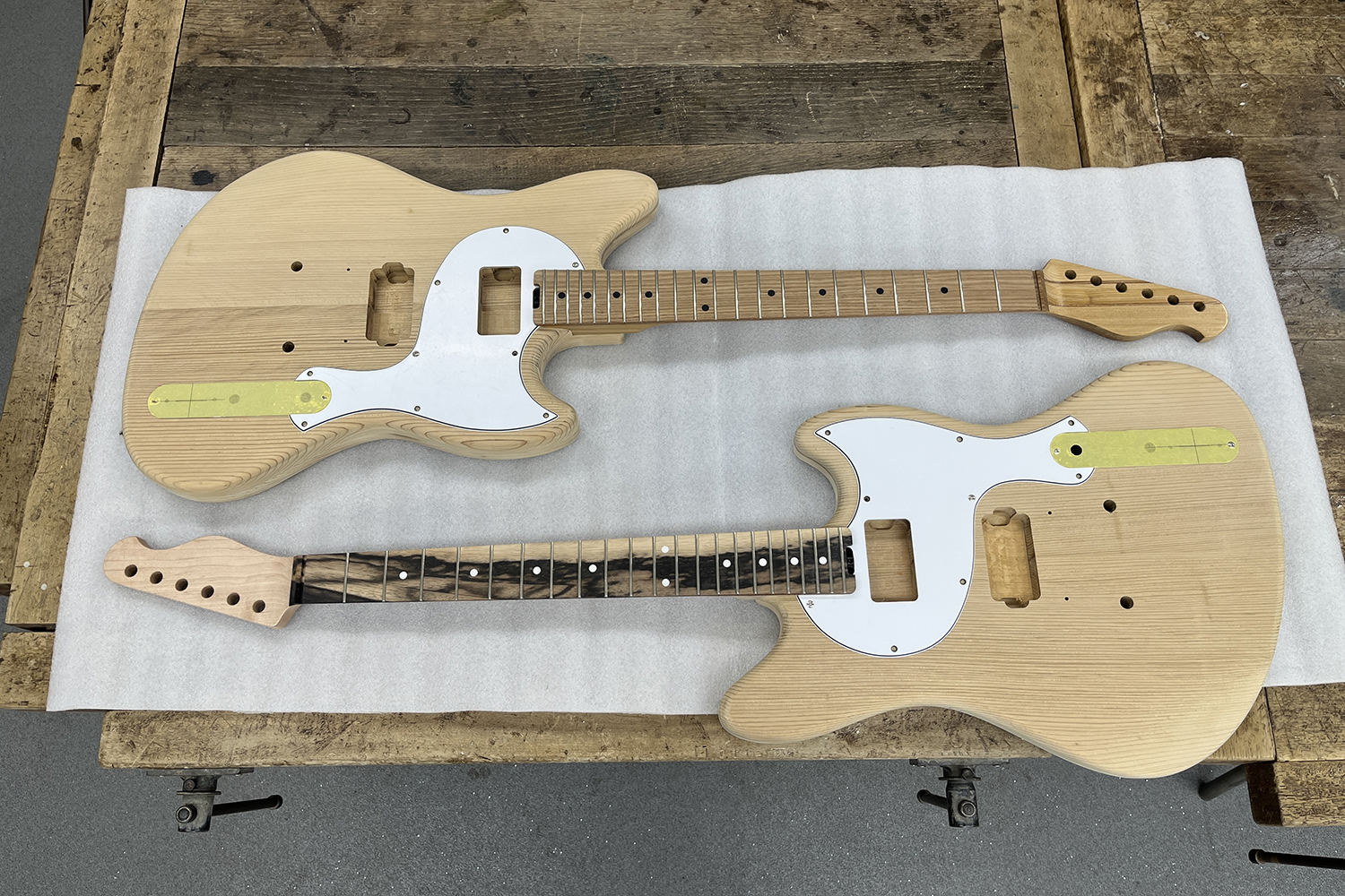 後の塗装に備えておきます。ここまで作業を終えた後、今回は細かい仕上がりの確認の為、ネックとボディ、そしてピックガードのマッチングまで行ってみることにしました。ここまでくると完全にギター!より完成が楽しみになってしまいました。