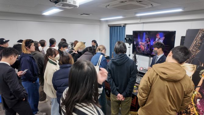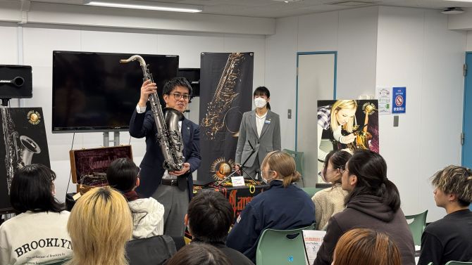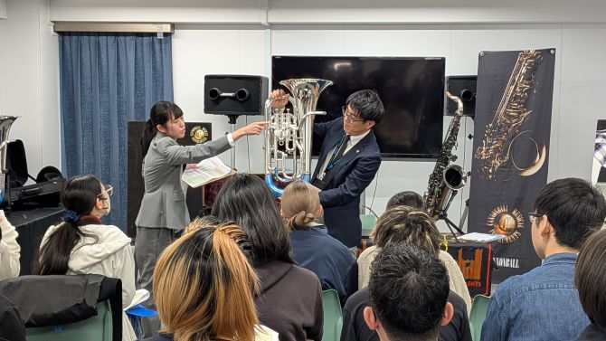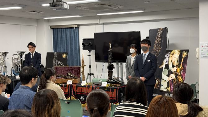 管楽器業界の現場で働く方から直接お話を聞く産学連携授業として、株式会社黒澤楽器店の方々をお招きし、