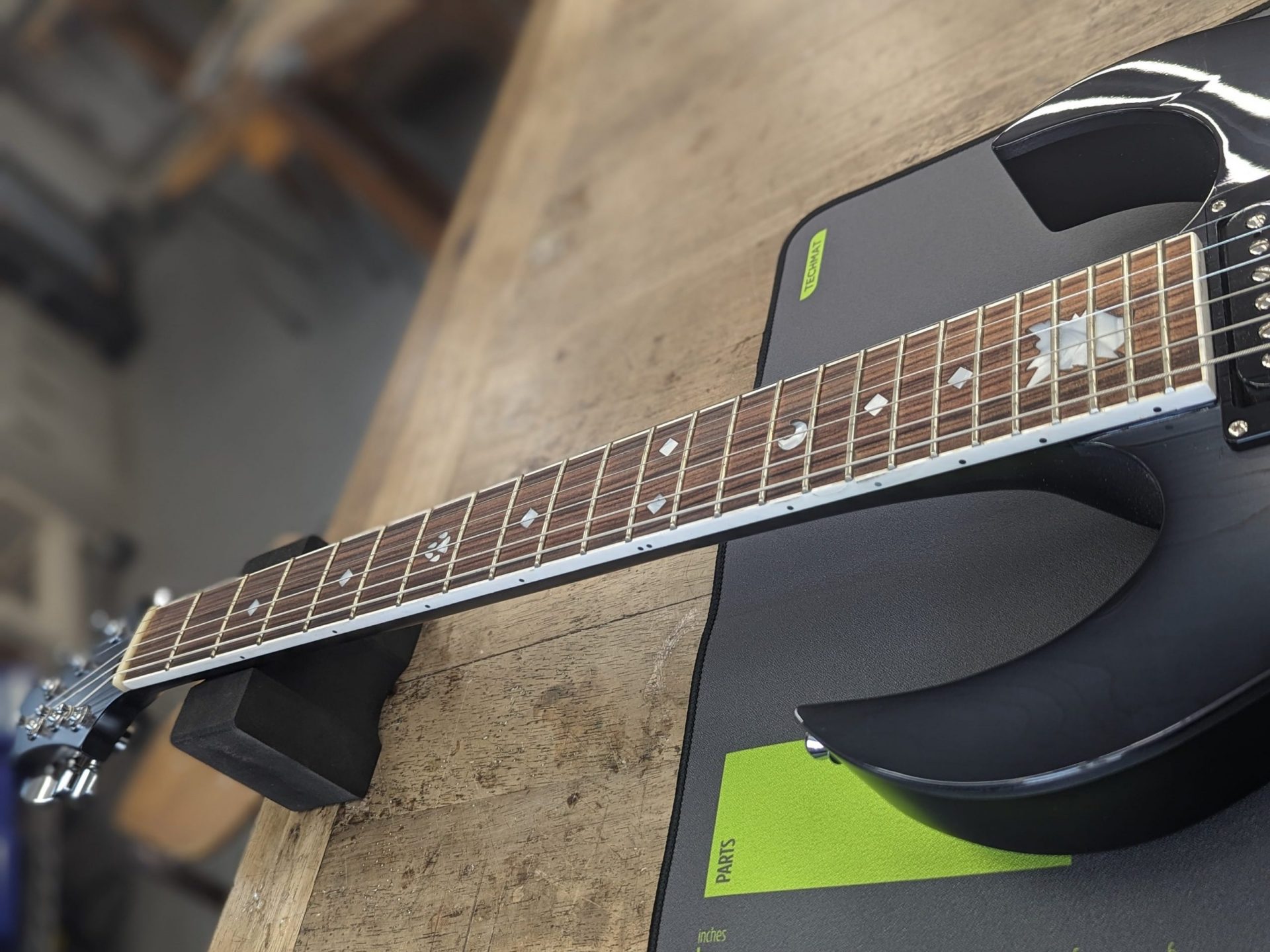 ナットを作ることが特に大変だなと思います。ナットはギター、ベースに1番重要な弦を支えるところでもあるので、弦間と弦高の細かな調整をしたり、弦溝を削ったりしているときに形が崩れてしまったりするとビビりの原因になってしまうので慎重に作業するようにしています。